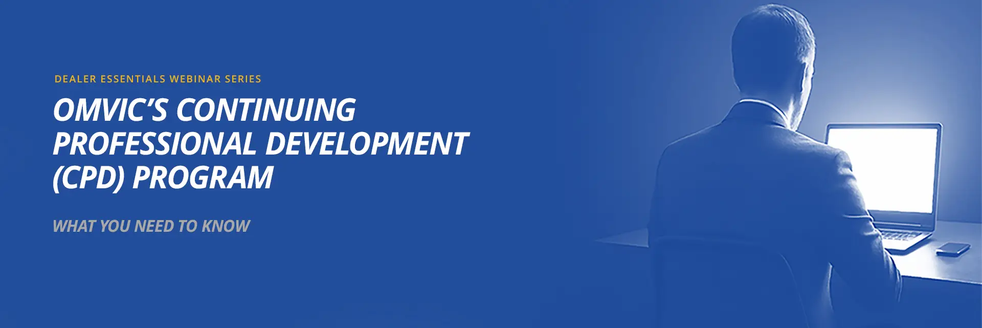 Join OMVIC for an informative webinar regarding the upcoming Continuing Professional Development (CPD) Program for all registered motor vehicle dealers and salespersons. This session provides a comprehensive overview of the upcoming CPD program, its requirements, and how it will support a more informed, ethical, and consumer-focused industry. This webinar is essential for dealers and salespersons committed to...