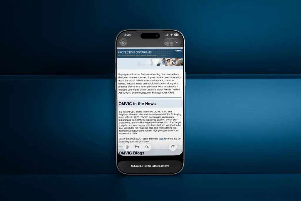 Serving as a valuable resource, OMVIC’s Consumer Wheels Report is designed for individuals who are shopping for a motor vehicle by providing valuable information to help them navigate the motor vehicle marketplace, read about industry trends, access educational resources. It offers important tips to empower car buyers, outlining their rights under both the Motor Vehicle Dealers Act (MVDA) and the Consumer Protection Act (CPA).
